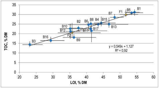 The average value of the loss on ignition was 41.1 ± 8.2% DM, and the average organic carbon content was 23.7 ± 4.7% DM. There was a linear relationship between the values of these indices (Figure 3). The coefficient of correlation (R2) for this relationship was high, and reached 0.92.