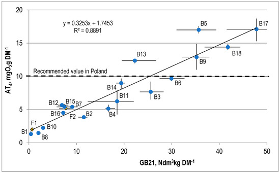 A similar tendency was observed in the present studies—AT4 values at the level of 5 mgO2g DM−1 correspond to the value of GB21 of 10 Ndm3kgDM−1, and the GB21 value of about 0 dm3kgDM−1 corresponds to the AT4 value of approximately 1.7 mg O2gDM−1 (Figure 4).
