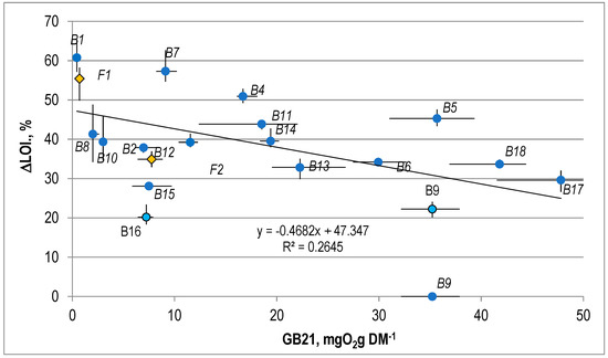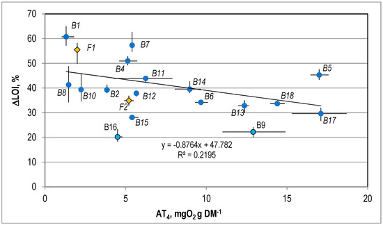 It was found that there was no linear correlation between ∆LOI and the value of AT4 (Figure 5) or GB21 (Figure 6) for the stabilized waste. The values of the coefficient of correlation (R2) for these correlations were 0.22 and 0.21.