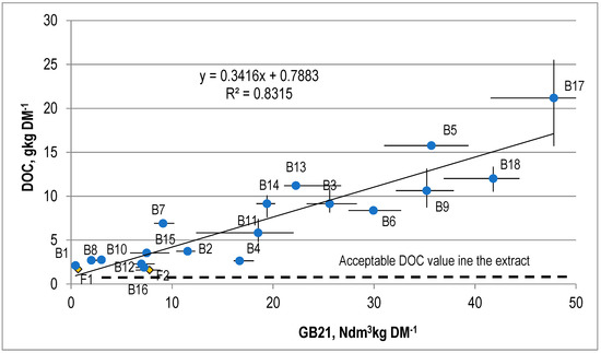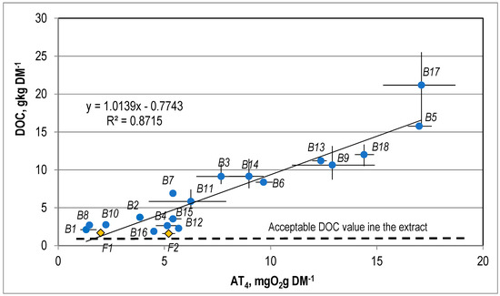 The correlation between DOC in the water extract from the stabilized waste and AT4 and GB21 is presented in Figure 7 and Figure 8.