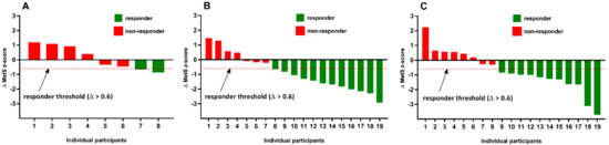 Metabolic syndrome (MetS) z-score responsiveness (Δ) for the control (A), standardized (B), and individualized (C) groups following 12 weeks of exercise training. The dashed line indicates the threshold of minimum change (Δ > 0.6) in a favorable direction that was required to be considered a responder.
