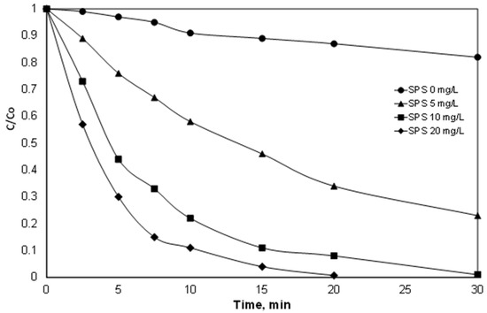 As shown in Figure 1, the role of the persulfate is crucial. The removal of PIR reached almost 100% after 20 min of reaction with the addition of 20 mg/L of SPS, while for the same time, the PIR removal was only 66% for [SPS] = 5 mg/L. It is worth mentioning that the consumption of 20 mg/L SPS reached 37% after 20 min of reaction.