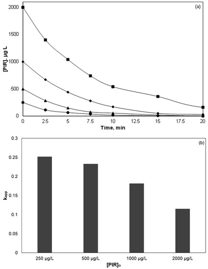 Since NSAIDs are detected in different concentrations and mixtures in environmental samples, it is vital to investigate the effect of their initial concentration on their decomposition. Figure 2 shows the destruction of four different initial concentrations of PIR, namely 0.25, 0.5, 1 and 2 mg/L, while all other experimental conditions remain constant. Concentrations of PIR were selected due to the limitations of the analytical methods used in this work. As shown in Figure 2a for a larger initial concentration of PIR, more time is required for the complete degradation of the drug. At the same time, when the initial concentration was 2 mg/L, residual concentration of PIR was detected after 20 min of oxidation; thus, the process did not completely degrade PIR, at least under the conditions in question.