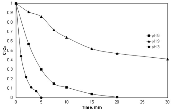 It is well known that most Fenton and Fenton-like reactions are favored in strongly acidic conditions. This is because iron at higher pH produced sludge due to the precipitation of Fe(OH)3 [14]. Indeed, as shown in Figure 3, the superiority of pH 3 versus pH 6.5 and 9 is evident. This is in agreement with the work of Delavaran Shiraz et al. [35], where the removal of catechol using iron activated persulfate was reduced as the pH of the solution increased from 2 to 10.