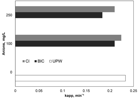 Therefore, additional experiments were conducted in the range of 0–250 mg/L of bicarbonates, and the results, expressed as apparent kinetic constants, are depicted in Figure 5. Interestingly, the presence of 250 mg/L of bicarbonate only slightly decreased the observed kinetic constant from 0.233 to 0.184 min−1. Similar results were reported by Yang et al. (2014) [39]. The researchers investigated the oxidation of three different organic contaminants namely benzoic acid, 3-cyclohexene-1-carboxylic acid, and cyclohexanecarboxylic acid using UV-activated persulfate. Interestingly, the researchers did not notice any significant difference in the presence or absence of carbonate ion for any of the three pollutants