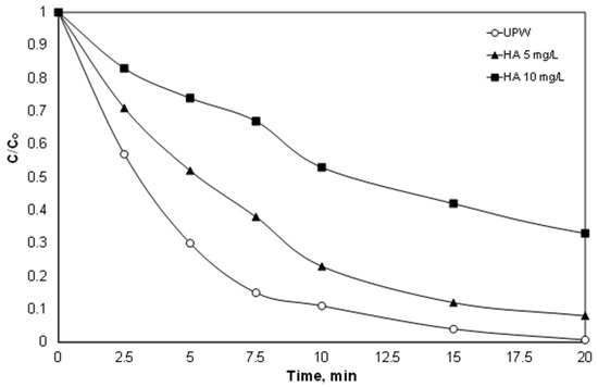 However, in addition to the anions, environmental samples usually also contain natural organic matter (NOM), which in the case of secondary effluent is often called effluent organic matter (efom), and it is well known that it is highly resistant to further oxidation [46]. Therefore, in another set of experiments, the effect of natural organic matter on the degradation of PIR was examined. To simulate the presence of organic matter, experiments were conducted in synthetic solutions containing 5 and 10 mg/L of technical-grade humic acid, and the results are depicted in Figure 6.