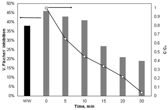 Finally, the variation of ecotoxicity during the treatment of 500 μg/L PIR spiked in the secondary effluent was assessed using the bacterium Vibrio Fischeri as an indicator, as well as the combined ultrasound/Fe2+/SPS process, and the results are depicted in Figure 9. As shown, the highest inhibition rate observed was due to the water matrix itself excluding PIR, where the latter made only a small contribution to V. Fischeri inhibition. The inhibition (which never exceeded 50%) decreased during the treatment; however, it did not do so with the same trend as the removal of PIR. This was due to the generation of byproducts from the oxidation of the organic matter of the secondary effluent that had different inhibition from both the parent compounds and the piroxicam.