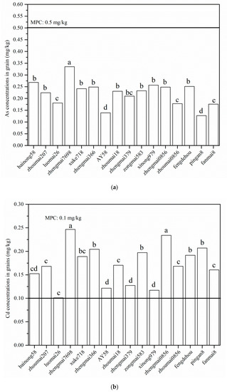 As, Cd, and Pb concentrations in grains should be a high priority because of the importance of food safety. The concentrations of As, Cd, and Pb in wheat grains for 16 wheat cultivars are presented in Figure 2, and then the concentrations of As, Cd, and Pb in wheat grains were compared with the MPC values (GB2762-2017) recommended by the Ministry of Health [40].
