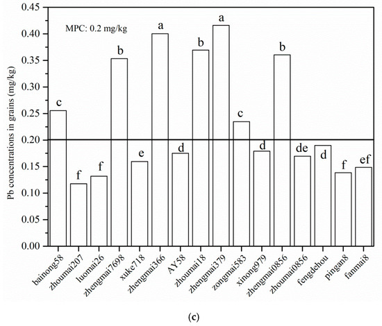 The Pb concentrations in the grains ranged between 0.12 mg kg−1 in Zhoumai207 and 0.42 mg kg−1 in Zhengmai379. The Pb concentrations in the grains were higher than the MPC value for eight wheat cultivars (Bainong58, Zhengmai7698, Zhengmai366, Zhoumai18, Zhengmai379, Zongmai583, and Zhengmai0856). In particular, the concentrations of Pb in grains of Zhengmai366 and Zhengmai379 were two times higher than the MPC value of 0.2 mg kg−1. Similar results were found by Liu et al., who observed that the concentrations of Cd and Pb in wheat grains from Zhengzhou were 0.56 and 0.87 mg kg−1 [43], respectively, and exceeded the MPC values of 0.1 mg kg−1 for Cd and 0.2 mg kg−1 for Pb (GB2746-2017) [40].