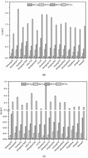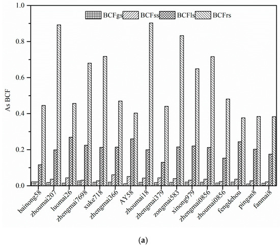 BCFs are usually used to evaluate the ability of plants to accumulate As, Cd, and Pb in their tissues. The BCFs of As, Cd, and Pb in different tissues for 16 wheat cultivars are shown in Figure 3. There were obvious differences in the BCFs of As, Cd, and Pb among the 16 wheat cultivars because of cultivar-specific differences, which agrees with Jamali et al. [54], who found that BCFs of heavy metals differed among different wheat cultivars. The BCFs for the 16 wheat cultivars decreased in the order of BCFrs > BCFls > BCFss > BCFgs. On average, the BCFrs values for As, Cd, and Pb were 31.67, 19.5, and 320.8 times higher, respectively, than the BCFgs values. The results agreed with the As, Cd, and Pb concentrations obtained in the tissues of the 16 wheat cultivars, indicating that As, Cd, and Pb were mainly accumulated in the root. These results can be explained by the fact that As, Cd, and Pb were mainly trapped in the roots and transportation from root to shoot was limited [43,55], because As, Cd, and Pb are toxic elements that are not required for crop or vegetable growth.