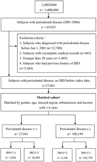The flow chart of enrollment is shown in Figure 1. Participants were selected by using the LHID2000 between January 1996 and December 2013. From 2001 to 2006, patients with PD were identified. The exclusion criteria included (1) history of PD before 2001, (2) incomplete medical records, (3) younger than 20 years, and (4) previous history of autoimmune disease. The index date referred to the date of diagnosis of PD (ICD-9-CM: 523.3, 523.4, and 523.5). The diagnosis of PD was made by licensed dentists. Individuals with PD were enrolled as the PD group. Furthermore, for each patient in the PD group, a matched control was identified with the same gender, age, insured region, urbanization, and income with a 1:4 ratio. We tracked both groups to identify individuals newly diagnosed with IBD. IBD was defined as CD (ICD-9-CM: 555.0, 555.1, 555.2, and 555.9) and UC (ICD-9-CM: 556.0, 556.6, 556.8, and 556.9).