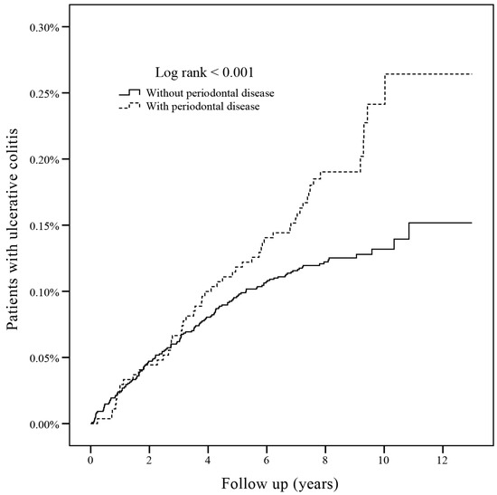 The strength of our study is a nationwide database with broad coverage and findings that are representative of the general population. A 13-year follow-up of a large population made our results statistically and scientifically significant. However, there are some limitations. First, information regarding laboratory tests is not available in our database. It is valuable to measure the related cytokine alterations and microbiota to investigate the complete mechanism behind the observed association between PD and UC. Second, the severity of PD may affect the risk of IBD. The DMFT index and related local findings are incomplete in the current database. Patients with more severe PD may have a higher risk of IBD, but further studies are required to evaluate this hypothesis. Furthermore, the severity of IBD and treatment responses is not analyzed. The observed association may be affected by disease severity and prognosis.