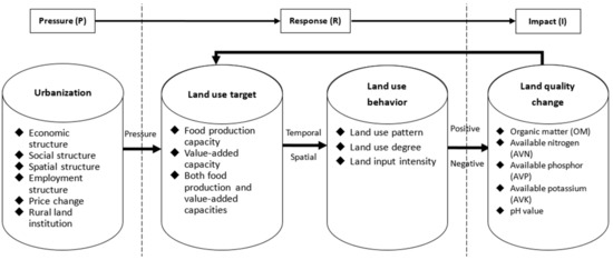 The impact of farmers’ land-use behavior on land quality in the process of urbanization has received much attention in various research fields. The studies on the relationship between land-use behavior and land quality have made considerable progress. However, their causal links and interaction mechanism in the context of urbanization are still unclear. To fill this gap, we built a pressure-response-impact (PRI) framework and employed SEMs to uncover how urbanization, land-use behavior and land quality interact.