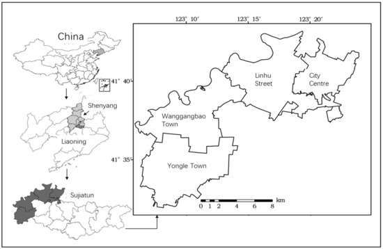 This study was conducted in 2015 in Sujiatun district, Shenyang city, Liaoning province. Based on the distance to the city centre of Sujiatun, as shown in Figure 2, and the soil sampling, Linhu street (suburb), Wanggangbao town (middle) and Yongle town (outer suburb) have also been selected for the following reasons: First, the study sites are located in the middle area of Liaohe Plain and Shenyang economic zone, where the conflict between cultivated land quality protection and socio-economic development is prominent. Second, the study sites are the main supply locations of vegetables and fruits for Shenyang city. Thus, cultivated land quality protection is important for farm product outputs and food security. Third, the study sites have been strongly affected by industrialization and urbanization [13]. Farmers in different areas are influenced by different socio-economic contexts, which would lead to different land-use behaviors and cultivated land quality status. As a result, the selection of study sites is representative.