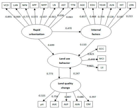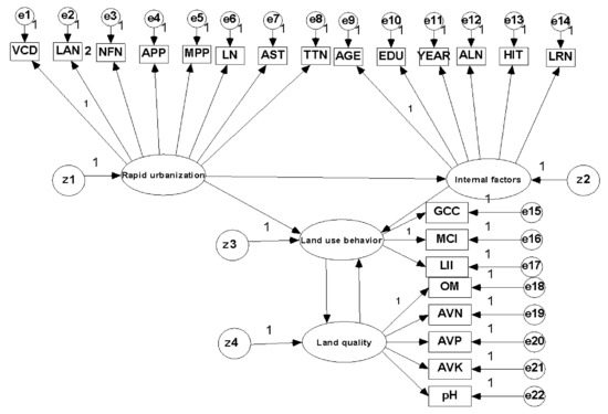 The structural equation diagram for urbanization-land use behavior-land quality analysis.