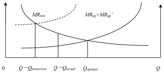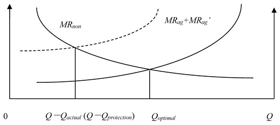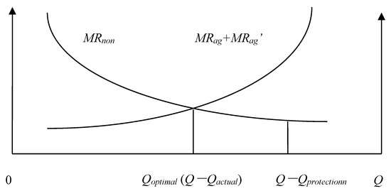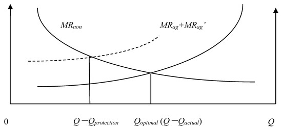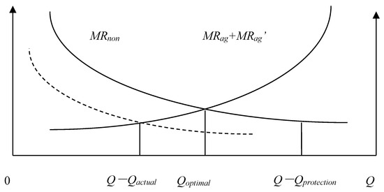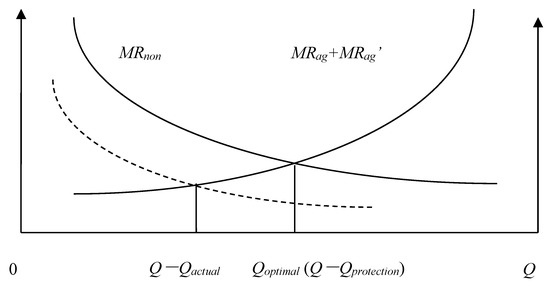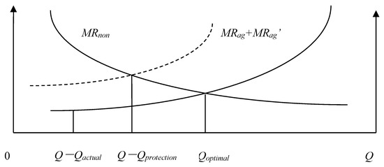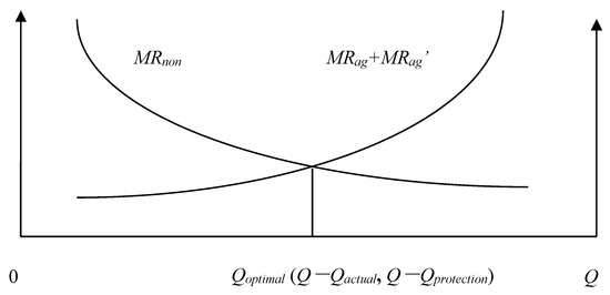 We will define the quantity of agricultural land that must be maintained Qprotection, the actual quantity of agricultural land Qactual, the Pareto optimal allocation quantity of agricultural land Q − Qoptimal, the marginal economic production value of agricultural land MRag, the marginal ecological service value of agricultural land MRag, and the marginal economic production value of construction land MRnon. According to the possible numerical relationships among Qprotection, Qactual, and Q − Qoptimal, the allocation of land resources of a county can be divided into the following eight situations: (1) Qactual = Q − Qoptimal = Qprotection; (Figure 1). (2) Qactual = Q − Qoptimal > Qprotection; (Figure 2). (3) Qactual > Q − Qoptimal = Qprotection; (Figure 3). (4) Qactual > Q − Qoptimal > Qprotection; (Figure 4). (5) Qactual = Qprotection > Q − Qoptimal; (Figure 5). (6) Qactual > Qprotection > Q − Qoptimal; (Figure 6). (7) Qprotection > Qactual = Q − Qoptimal; (Figure 7). (8) Qprotection > Qactual > Q − Qoptimal. (Figure 8). We must point out that when the marginal value of land resources are equal between agricultural and nonagricultural uses, agricultural land will no longer be transformed to nonagricultural uses. Therefore, we will only discuss the situation of Qactual ≥ Q − Qoptimal.