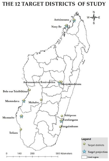 - For the study of climate and health trends: 12 districts (Antananarivo, Manjakandriana, Antsiranana, Nosy Be, Morondava, Belo on Tsiribihina, Mahabo, Toliara I, Morombe, Farafangana, Vangaindrano, Vohipeno) (Figure 2);