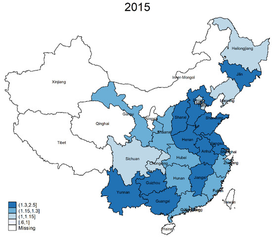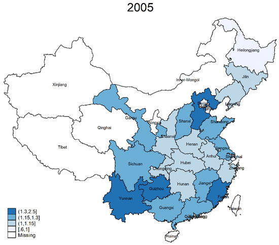 Figure 1 depicts the provincial snapshot of health status in 2005 and 2015; the darker the color, the better the health. As shown, in 2005, the health status is quite scattered, while in 2015, there seems to have been declining health in eastern and western areas except Yunnan, Guizhou, and Guangxi, three provinces with more areas of higher elevation. In general, from 2005 to 2015, the average health status showed some improvement, particularly in the middle and lower reaches of the Yangtze River.