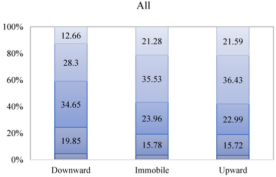To visualize how self-perceived class mobility is associated with individual health status, Figure 2 is drawn to show the distribution of health status across different types of mobility patterns. From left to right, each bar presents the perception of downward mobility, immobility, and upward mobility. For each bar, there are five segments; these segments add up to 100% for that specific mobility pattern.