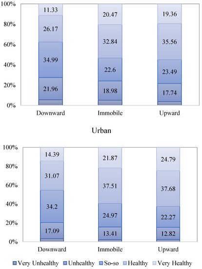 When examining class mobility, there has been a long-standing debate about whether holding low-wage jobs improves the chances of upward mobility [35,36,37]. The mixed results in previous studies imply that subjective evaluation of class may be a potential factor to consider. In Model 2, we accounted for self-rated class, a factor not only highly correlated with self-perceived class mobility, but also self-rated health level. As shown, when including subjective class, the magnitude of the self-perceived mobility reduced to about half compared to Model 1. When further controlling for a series of individual and familial characteristics, such as residence, age, gender, party membership, marital status, work status, years of schooling, and total family income, that have proved to be central in predicting self-rated health in previous studies in Model 3, the effect of self-perceived mobility only slightly decreased. The results show that compared to those who consider themselves as experiencing downward mobility, the odds of being very healthy and healthy versus the combined so-so, unhealthy, and very unhealthy were about 6.29% (=) higher for those who perceived themselves as having no mobility and 11.29% (=) higher for those who perceived themselves as experiencing upward mobility, holding constant of other factors. Even when switching the reference category to immobility, those who perceived themselves as having upward mobility were still more likely to rate themselves as significantly healthier. Moreover, the results of residence suggest that, urban residents rated themselves healthier compared with rural residents. As rural and urban areas are often associated with different class structure and mobility chances, in order to show how the perceptions to class mobility vary in rural and urban samples, we further run the regression for rural and urban samples respectively. From Table 4, it is clear that self-perceived class mobility was more strongly associated with self-rated health in rural areas than urban areas. It is shown, the odds of being very healthy and healthy versus the combined so-so, unhealthy, and very unhealthy were about 13.5% (=) higher for those who perceived themselves to upwardly mobile in rural areas, compared to those who consider themselves as experiencing downward mobility. However, the relative odds in urban areas was only 5.94% (=), and it is only marginally significant. If taking immobility as the reference group, self-perception of experiencing upward mobility was significantly associated with higher health level in rural areas, but not in urban areas (not shown, but available upon request).