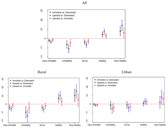 Recent scholarship has proposed that it is often problematic to compare log-odds or odds ratios across models with different predictors in logistic regression, since unobserved heterogeneity tends to vary across models [38]. We thus present the average partial effect of self-perceived class mobility on the probability of rating oneself as very unhealthy, unhealthy, so-so, healthy, and very healthy in Table 5. This result is calculated based on Model 3 in Table 3 and by-residence results in Table 4. As shown, perceiving oneself as remaining stable compared to experiencing downward mobility would on average reduce an individual’s probability of reporting lower health—by 0.002 for “very unhealthy,” by 0.006 for “unhealthy,” and by 0.004 for “so-so”—and would increase the probability of an individual reporting better health— by 0.004 for “healthy” and by 0.008 for “very healthy.” Such partial changes are prevalent in rural areas, not urban areas. It is also the case when comparing those who perceived themselves as experiencing upward mobility versus downward mobility or immobility, the significant partial changes in probability of (i = 1,2,3,4,5) were significant only in rural areas. In urban areas, such partial changes in probability of (i = 1,2,3,4,5) either had marginal significance, or no significance. Figure 3 is further drawn to illustrate such pattern.
