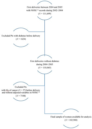 This study used customized health information from the National Health Insurance Cooperation that could be modified as requested for the purpose of policy and academic research (https://nhiss.nhis.or.kr). Using this database during 2002–2015, we identified all women in South Korea who had their first delivery between 1 January 2004 and 31 December 2005 (Figure S1 in Supplementary Materials). To facilitate the evaluation of the pre-pregnancy characteristics, women were only included in the analysis if they underwent an NHSE at least 2 years before their first delivery; the NHSE consists of a health interview and a health examination. The health interview included questions regarding patients’ demographic, socioeconomic and lifestyle characteristics. To investigate the association between GDM and cancer in women after their first delivery, we excluded those with pre-existing type 1 DM and diagnosed type 2 DM before delivery based on the International Classification of Disease Tenth Revision codes (ICD)-10 (O24.0, O24.1, O24.3 and E11). We did this before their first delivery in order to facilitate the evaluation of the pre-pregnancy characteristics. Additionally, we excluded women who were diagnosed as having cancer during 2002–2003, as they were assumed to be newly diagnosed as having cancer. Finally, 102,900 women who experienced their first delivery were included in this study. This study was approved by the Ethics Committee of the National Health Insurance Service, Ilsan Hospital (approval number: NHIMC 2017-01-012).