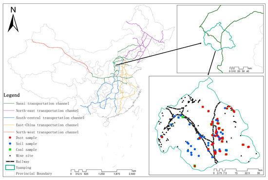 Yuanping (38°35′–39°09′ N, 112°17′–113°35′ E) is located in the north of Shanxi Province and a major coal transportation hub between the south of Shanxi and northern China (Figure 1). The city has an area of approximately 2560 km2 and is rich in mineral resources. It is surrounded by many large coalfields distributed in the northwest: Ningwu, Datong, Xishan, and Qinshui. Yuanping has a prevailing northwest wind that occurs in spring. It belongs to the temperate continental climate zone and has an average annual temperature of 9.8 °C and average annual precipitation of 417.1 mL. Yuanping is located along the Sanxi coal transportation channel (contains coal transportation channels in Shanxi, Shaanxi, and western Inner Mongolia), and the Beijing–Yuanping, Beitongpu, and Shuohuang railways intersect in the city, which has a total transportation area of 39.87 km2.