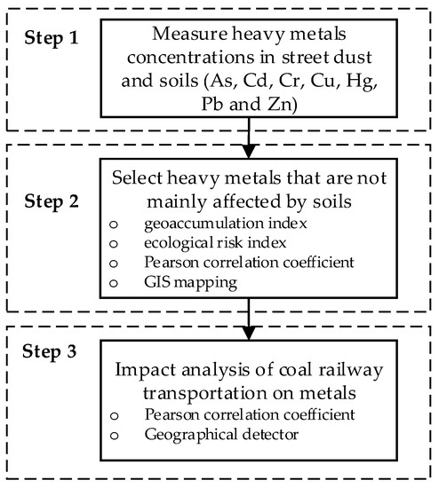 This article describes a study that focused on the coal transportation hub of Yuanping in Shanxi Province and analysed the effects of railway coal transportation on the surrounding environment. The study assessed the levels of contamination in street dust of the following heavy metals: arsenic (As), cadmium (Cd), chromium (Cr), copper (Cu), mercury (Hg), nickel (Ni), lead (Pb), and zinc (Zn). As is a metalloid, but its physicochemical properties are similar to those of heavy metals, so As is usually analysed according to the analysis method of heavy metals [11,36] and the term “heavy metal” was used for all the elements in this study. The study employed the geoaccumulation index (Igeo) and ecological risk index (RI; [37,38,39,40]. The relative levels of contamination of heavy metals in soils and in street dust were compared to exclude the influence of soils on street dust contamination. Furthermore, the contamination impacts of mining and transportation were separated by correlation and geographical detector analysis.