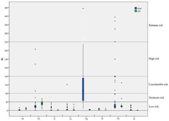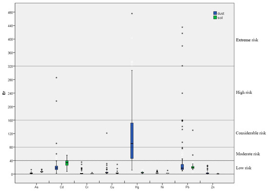 The results for the heavy metals in street dust and soils were shown in Figure 4. For street dust, almost all sampling points reported low potential ecological risk from As, Cd, Cr, Cu, Ni, Pb, and Zn. Most of the values of Hg were between 40 and 160, indicating moderate to considerable potential ecological risk, while a few sampling points showed a similar moderate-to-considerable potential risk from Cd, Cu, and Pb. A small number of sampling points returned results, which indicated a high potential for ecological risk from Cd and Pb and an extremely high risk from Hg and Pb. On the whole, the potential ecological risk results of street dust samples were significantly higher than those of soils samples, particularly in the cases of Cr, Cu, Hg, Pb, and Zn.