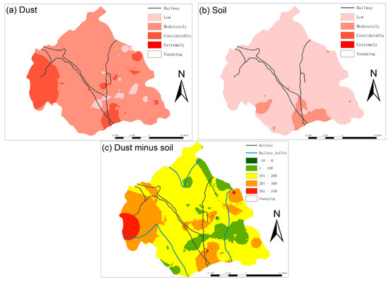 The differences in ecological risk that are presented by street dust and soils were computed using values of street dust samples minus those of soils (Figure 5c). The differences were larger in the north-western, central, south-central, and north-eastern regions of Yuanping, which are areas generally distributed around the railway (Figure 5c). In almost all areas, the values of heavy metals were higher in street dust than in soils. In other words, a greater ecological risk is posed by heavy metals in street dust than in soils. The impact of street dust has been shown to be contained within 10 km of railway lines [54], as illustrated on the map in Figure 5c by a 10-km zone on either side of the railway. Most of the high-value regions were within this zone, indicating that the railway might have caused the different concentrations in heavy metals between street dust and soils.