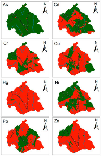 The was originally introduced by Hakanson [47] and quantitatively expresses the potential ecological risk of single or multiple elements. The is calculated as follows [39,47]: