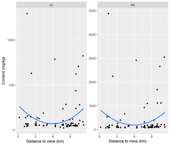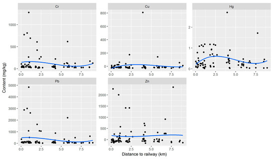 From the above analysis, it was assumed that the railway had some influence on the heavy-metal content of street dust, especially for Cr, Cu, Hg, Pb, and Zn. Since the railway’s effect on street dust was confined to an area within 10 km of the track, those sampling points of the five heavy metals that fell within this area (80 of the total 94) were selected to analyse the correlation between the distance to the railway and the heavy-metal concentrations in the sampled street dust. The correlation analysis of this study was completed using R software (The University of Auckland, Auckland, New Zealand).