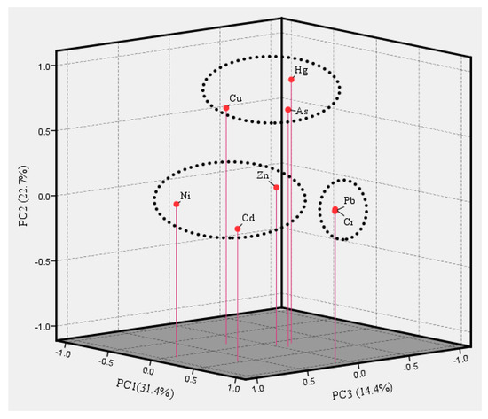 Heavy metals in street dust mainly originate from natural sources [11,29,30], such as soils [31] and human activity, such as mining. Transportation networks are the main source of street dust and the main contributors to heavy metals in street dust in some developed transportation areas [43]. The principal component analysis (PCA) is a generally used method to identify the pollution source the heavy metals in street dust [28]. The Bartlett’s sphericity test was significant at p < 0.001, which confirmed that the heavy-metal concentrations in street dust were suitable for PCA in this study. The first principle component (PC1) explains 31.4% of the total variance and included significant loadings for Cr and Pb with loading values of 0.97 and 0.96, respectively (Figure 9), indicating that they have a same potential source of pollution. Of course, heavy metals in soils could transfer to street dust [31], but concentrations and ecological risk of Cr and Pb were higher in street dust than that in soils, suggesting that the pollution of these metals resulting from soils is limited. The PD and correlation coefficients results further illustrates that their source was railway and mines, and the effect of railway in street dust was greater than that of mines on Cr and Pb levels in street dust. Cr and Pb are commonly used in different plastics and building materials [28,61]. However, traffic sources is another source of Cr and Pb in street dust [28]. Cr is often generated from coal [27] and Pb is usually found in vehicles [62,63], and coal railway transportation is happens to be the combination of coal and transportation. The second principle component (PC2) explains 22.7% of the total variance, including As, Cu, and Hg (Figure 9). For PC2, As is associated with soil parent materials [64], which can explain why the content of As in soils was higher than that in street dust. Cu is key component of building materials [65,66] and Hg is widely used in pesticides, such as thermometers [67,68,69]. Coal combustion is one of the main sources of Hg in Shanxi province [36,70]. The source of PC2 is mainly related to human life activities. The third principle component (PC3) explains 14.4% of the total variance, including Cd, Ni, and Zn (Figure 9). The enrichment of Cd and Zn in soils was closely correlated to agricultural production [71]. Cd is usually considered as an element included in the use of phosphate fertilizer, livestock manure, and so on [72]. In addition, Cd is an important element of lubricating oil and tires [25]. Ni and Zn can also be found in automobiles [62]. So, the origin of this principle component was mainly related to agricultural activities and vehicular transport [36].
