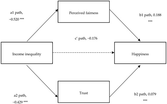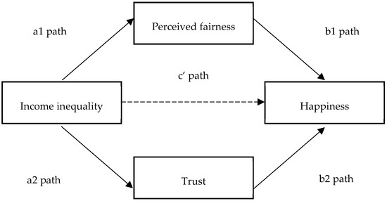 In this study, we explored two psychological mechanisms to account for the link between income inequality and happiness following Oishi et al. []. One is through a fairness mechanism, while the other is through a mechanism of trust. Perceived fairness has been shown to be an important factor that affects happiness []. The fairness mechanism comes from equity theory. Equity theory, proposed by Adams [], is about whether the resource distribution is fair to both relational partners. Based on this theory, stress will be suffered by both the person who is under-rewarded and the person who is over-rewarded. This stress makes them strive to restore a fair relationship []. Equity theory maintains that balanced relationships contribute to higher levels of well-being []. However, when people find themselves involved in unfair relationships, they may become distressed. The greater the inequity the individual perceives (in the form of either overreward or underreward), the more distress the individual feels []. People who get too much may feel guilty or shameful. People who get too little may feel angry or humiliated []. Though both people who get too much and people who get too little feel distressed, for people who get too little, the feeling of unfairness can be stronger []. When people find themselves at a disadvantage in comparison with other people, these people will experience a sense of unfairness, thereby stimulating negative psychological perceptions []. The unbalanced economic development during the social and economic transition period has led to the widening income inequality between the rich and the poor in China. Some groups may have not been able to share in the fruits of social progress or have been in the position of economic disadvantage. Thus, they feel a strong sense of frustration, relative deprivation, and unfairness. Based on equity theory and China’s reality, we hypothesized that unfairness may explain the negative relationship between income inequality and happiness.