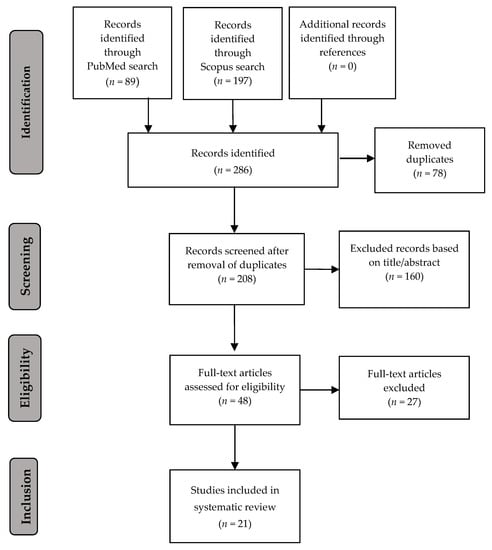 The literature search using the described keywords yielded 89 results in PubMed and 197 results in Scopus, as presented in Figure 1. A first screening based on title and abstract resulted in 48 articles after the elimination of duplicates. After full-text read-through, 21 studies were selected for inclusion. No additional articles fitting the predefined criteria were detected via the references.