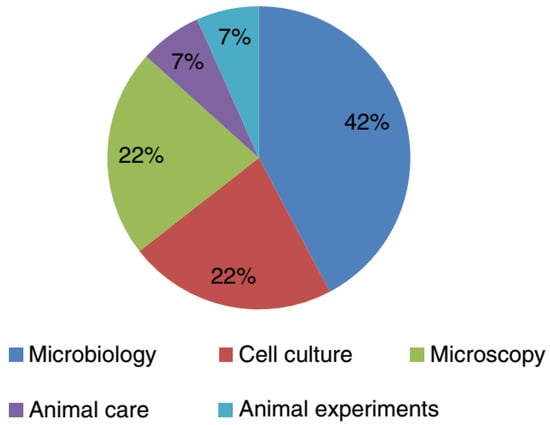 Initial inspections of laboratory-acquired tuberculosis documented the prevalence of pathogenic Mycobacterium tuberculosis three to nine times higher amongst laboratory employees compared with the general population [34]. Nonetheless, laboratory-associated tuberculosis is extremely challenging to recognize owing to the wide-environmental dissemination of these microorganisms and chronicity of the infection [35]. The extreme menace of LAI for laboratory staffs handling M. tuberculosis is related to the aerosols generation. Also, the literature survey revealed some M. tuberculosis cases occurred due to inadequate isolation techniques and high capacities of specimens handled. It is important to handle mycobacteria in class II or III BSC to avoid their associated possible LAI [34]. Recently, Wurtz et al. [36] surveyed laboratory-acquired infections around the world in BSL-3 and BSL-4 laboratories. Out of 23 laboratories, only four reported around fifteen LAIs cases caused by four different pathogenic cultures. These have been classified as BSL-3 bacteria and belong to the species (1) Mycobacterium tuberculosis (ten cases), (2) Coxiella burnetii (two cases), and (3) Brucella melitensis (two cases), while other reported cased were caused by a BSL-2 virus. The percent distribution of the majority of the LAIs (73%) that occurred in a BSL-3 laboratory was as follows: microbiology activities (42%), followed by microscopy (22%), and cell culture (22%) (Figure 3) [36]. Also, the laboratory personnel should undergo an annual Mantoux purified protein derivative skin test or an interferon-γ release assay to demonstrate conversion. The persons with positive test results should be further investigated for active tuberculosis by chest radiography [37].