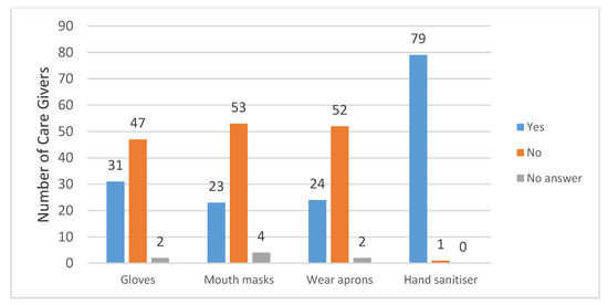 Most of the caregivers do not use any protective gear when working. Data obtained showed that 47 of the caregivers do not wear gloves, 53 do not wear mouth masks, and 52 do not wear aprons. However, 79 of them use hand sanitisers after nursing patients. The hand sanitiser is used as a form of protection to prevent contamination (Figure 1).