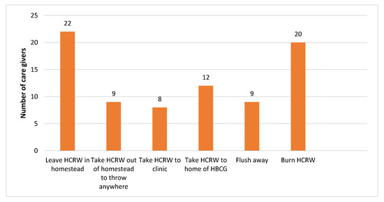 Questionnaire data collected indicates, as shown in Figure 2, that 22 caregivers leave the generated waste at the homestead where it was generated, nine throw the waste anywhere deemed fit by them, eight take the waste to the nearest health clinics to be disposed along with other health care waste, 20 burn the waste, and nine flush or discard it in a pit latrine. The health care risk waste left in the household is either stored in plastic bags or general waste containers for approximately one week.