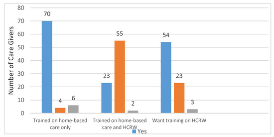 According to the caregivers, training has not been provided for everyone. Only 70 caregivers had received training on home-based care before they assumed their duties; and four caregivers indicated that they did not receive any form of training (Figure 3). Furthermore, 55 caregivers said they have never been trained on health care risk waste management, while 23 reported that they had been trained (Figure 3); 54 of them want to be trained on health care risk waste management.