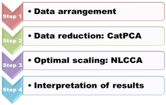 NLCCA was first developed by a doctoral student in the Department of Data Theory at the University of Leiden in the Netherlands [] and it was documented by Gifi [] and van der Burg and de Leeuw []. The objective of NLCCA is to find what is common between sets of variables. NLCCA is a form of homogeneity analysis with restrictions. Homogeneity analysis determines transformations of the categories of variables to maximize homogeneity, and it is the basic technique in the Gifi system of descriptive nonlinear multivariate analysis. The Gifi system is characterized by the optimal scaling of categorical variables, which is implemented by using alternating least squares (ALS). The ALS algorithm is known as the OVERALS algorithm [,]. Unlike traditional canonical correlation analysis, no assumptions are made about the variables’ distributions, nor are the variables’ presumed to be related in a linear way []. Moreover, the algorithm can handle more than two sets of variables. OVERALS is available in SPSS Categories 10.0 and later versions [].