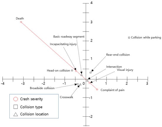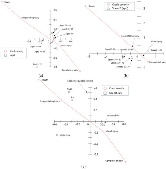 Since the major purpose of motorcycle trips in Seoul metropolitan area is the fast delivery of food and parcels, most motorcyclists are inexperienced, and young motorcyclists and motorcyclists are required to make fast delivery times []. Therefore, to develop more specified countermeasures for motorcycle safety, further analysis is required to identify the relationship between the crash severity and types of delivery for such foods and parcels. Further studies could be conducted with additional variables that can affect motorcycle crash severity. Examples include the usage of motorcycle protective clothing, congestion level, traffic volume at the crash moment, and displacement variables with respect to crashed motorcycles. Specifically, more accurate crash speed data available from vehicle state-of-the-art technologies, such as vehicle black boxes and event data recorders can be used [,,]. Finally, the methods applied in this study show the relationships in relative scales based on graphical displays rather than parameter estimates. Visualizing the results from the methods can form a basis for an analysis on the interpretation of model parameters. Consequently, further studies could be done to develop parametric models based on nonlinear optimal scaling methods.