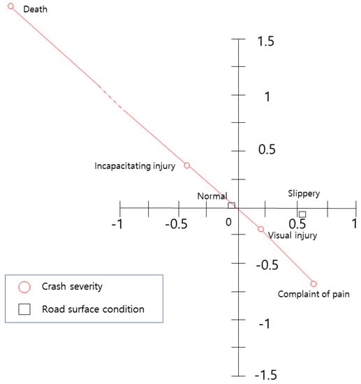 The relationship between the roadway surface conditions and the crash severity is presented in Figure 6. Since the variable for normal surface conditions is located in the second quadrant, it is interpreted as a factor that increases crash severity. This result could be due to the fact that dry weather prevails all year round. However, its location is very close to the origin. Thus, this variable is not an effective one for crash severity. Slippery conditions increase the possibility of crashes due to the variable’s location, but they do not have a direct relationship with crash severity, due to the angle between the crash severity points and the variable location.
