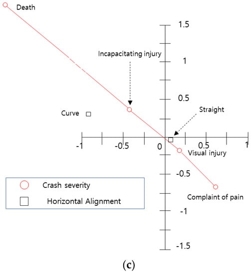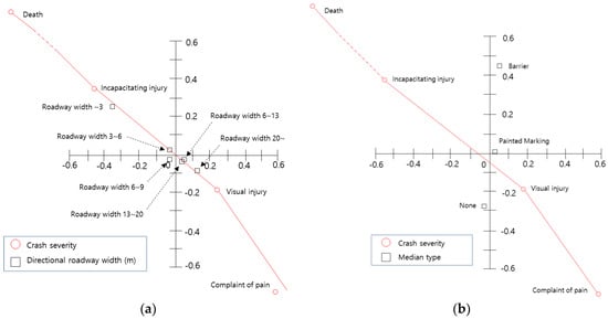The relationship between crash severity, roadway facilities, and geometry is shown in Figure 7. As shown in Figure 7a, since the variables related to ‘directional roadway width of less than 6 m’ are located in the second quadrant, they are correlated with ‘incapacitating injury’. Particularly, the variable ‘directional roadway width of less than 3 m’ is more correlated with ‘incapacitating injury’ than the other variable. In other words, the narrower the roadway, the greater the crash severity is. Figure 7b shows that the presence of a median barrier has no relationship with crash severity, and Figure 7c shows that curved sections have a significant impact on crash severity.