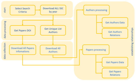 - Data collection. In this stage, two threads of work are launched in parallel: one that oversees downloading all the information of the authors for each one of the Scopus-ID of the list, generating at least one file per author; and another that will download all the information of the articles for each one of the DOIs of the list of papers. Therefore, a directory for authors and another for articles where all the mentioned information will be stored is obtained as output.