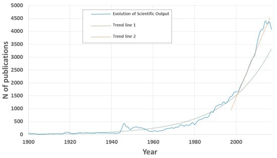The search yielded 85,370 results, whose growth is represented in Figure 2. As can be observed, the data show two trends. The first of them extends throughout the twentieth century, and it is exponential, while the second one is from the year 2000 to the present, and it is linear. In the first of the periods, the adjustment to the trend line is optimal, giving rise to a regression coefficient R2 greater than 0.9. The only data that separates from this trend line corresponds to the number of articles published in the year 1946, which is 429. This data is abnormally high. In fact, it is not reached and exceeded completely until the 1980s. The explanation for this is found in two milestones of great importance in the fight against malaria that took place in that year. On the one hand, chloroquine was recognized and established as an effective and safe antimalarial agent [37]. And, on the other hand, the CDC (Communicable Disease Center) was created from the Office of MCMA (Malaria Control in War Areas), whose main objective was to fight against diseases such as malaria in the South of the United States during the Second World War. Currently, the CDC is the main North American public health agency and its mission is “collaborate to create the expertise, information, and tools that people, and communities need to protect their health—through health promotion, prevention of disease, injury, and disability—and preparedness for new health threats.” Although the initial objective of the CDC was the control and elimination of malaria, its current role is aimed at prevention and surveillance, because it is considered eradicated in the USA since 1951.