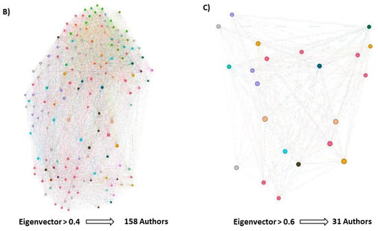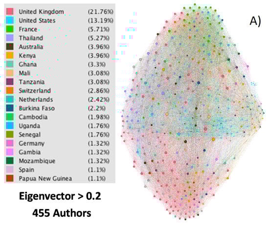 In the 85,370 published articles on malaria in the period studied, 148,876 authors and a total of 2,211,628 collaborations appear among them. In Table 1, the 20 most important authors can be observed. To establish this ranking, the eigenvector centrality or eigencentrality has been taken into account. In graph theory this is used to highlight the influence of a node in a network. Other values that could be used to measure the importance of an author are the H-index [38], the number of published articles, or the number of citations received by these articles. But the possibility that an author has worked in different areas or themes could mask the result. However, a high score of the eigenvector is directly related to the value that an author has within a network in which each author is identified with a node, and in which the connections of each node are preferably scored with other nodes of a high score. Figure 3A shows the 455 authors represented by nodes with an eigencentrality value greater than 0.2, and their connections with the rest of the nodes (authors). Figure 3B shows the 158 authors represented by nodes with an eigencentrality value greater than 0.4, and Figure 3C shows the 31 authors represented by nodes with an eigencentrality value greater than 0.6. The very high density of relations that exist between authors, it is possible to emphasize above all with an eigenvector >0.2. The size of each node is proportional to the value of its eigencentrality, and the color is representative of the country from which the author’s institutional affiliation.