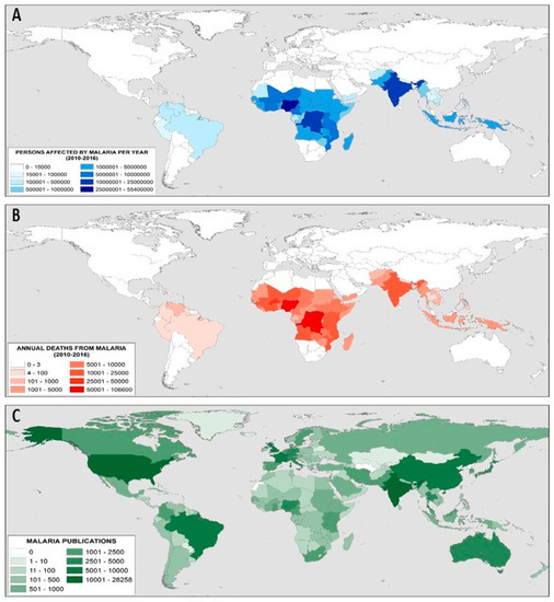 World map on malaria: (A) Cases estimated by the World Health Organization in the period 2010–2016; (B) Number of deaths estimated by the World Health Organization in the period 2010–2016; (C) Number of publications on malaria in the period 1900–2017.