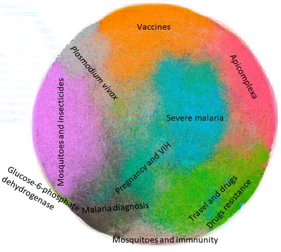 From 85,370 published articles, 714,979 citations were counted—the citations to nodes of topics other than malaria were not included. On the other hand, 149,143 keywords defined by the authors appear in these articles. Both data allow us, using genetic algorithms, to establish a series of thematic SC, of which, the most frequent are represented in Table 2. In the table only appear SC composed of at least 1% of the total of 85,370 articles published. To supplement Table 2, Figure 5 has been carried out. The information that codifies Figure 5 has to do with the relative size of one community in front of the other as well as the proximity of certain communities to each other, depending on how close the nodes in the graph are.