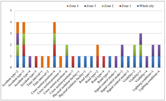 As shown in the previous study by Al-Ghamdi [22], accident type is a common influence factor, and needs attention when the value is 2 or 3. In the whole city, zone 2 and zone 4 should pay attention to accident types 2 and 3. In zone 3, accident type 4 should be focused besides accident type 2. In zone 1, accident type 5 should be focused besides accident type 3.