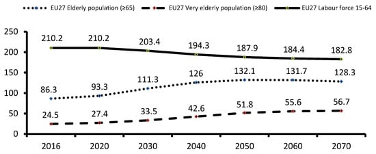 4]. In 2016, the Potential Support Ratio of the EU-27 was 2.44, a figure which is expected to decrease to 1.83 in 2030, and even to 1.4 in 2050 (see